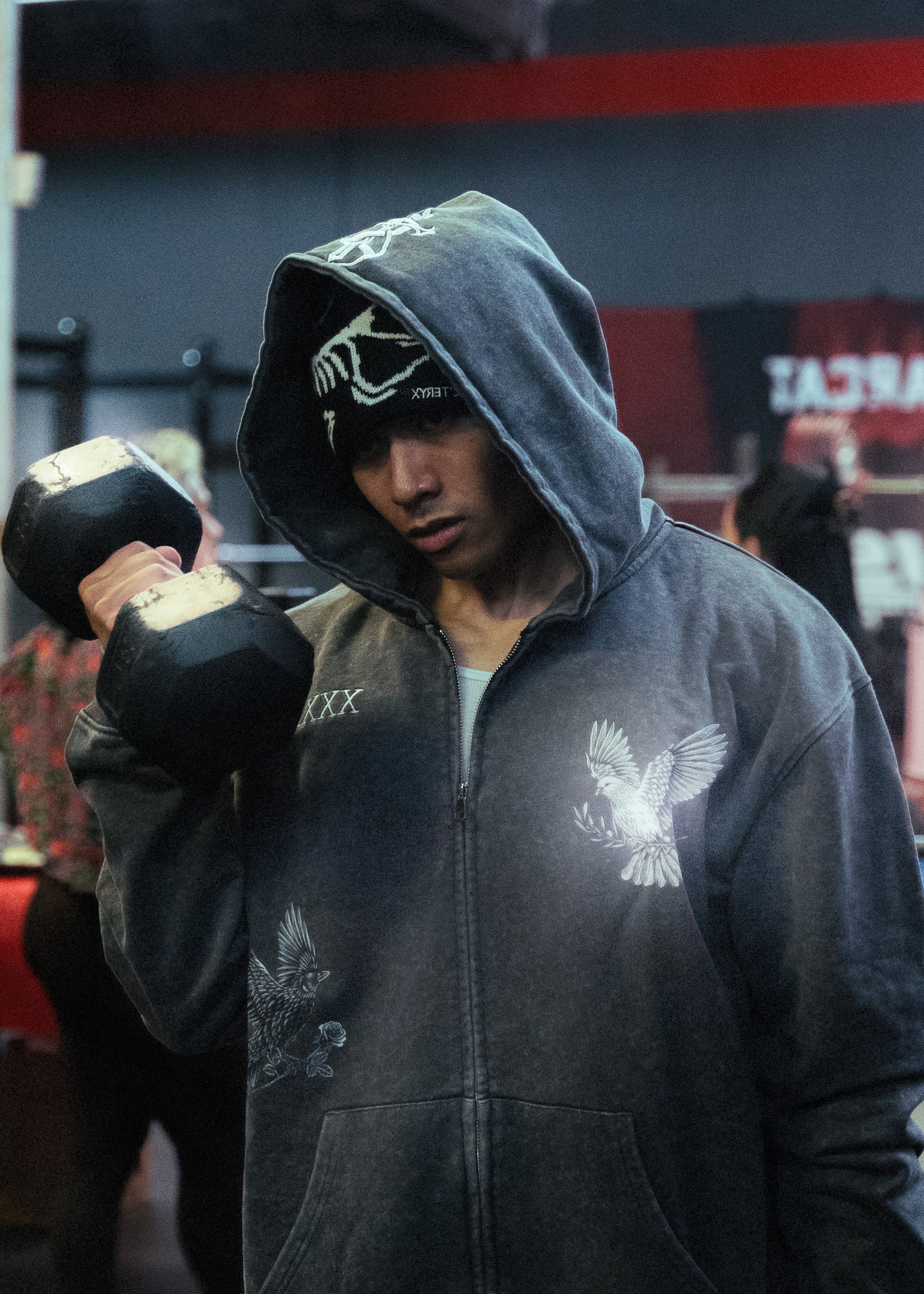 Featuring digital printed graphics on the front and back, the design stands out with bold detail. The hood carries an additional embroidered logo, complemented by Roman numeral embroidery for a subtle, elevated touch.